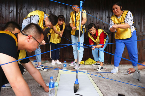 “共書未來”活動中,各隊成員同執(zhí)一支筆,把此次的收獲融合企業(yè)文化總結成了四字成語共同書寫在四尺紙卷上。